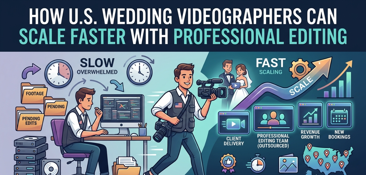 For some videographers, editing assistance is an expense. It is viewed as an asset by successful studios. Professional wedding video editing protects your creative quality, speeds up delivery, reduces burnout, increases booking capacity, and improves client satisfaction. Efficiency and consistency determine who grows and who remains stagnant in the competitive U.S. wedding market.